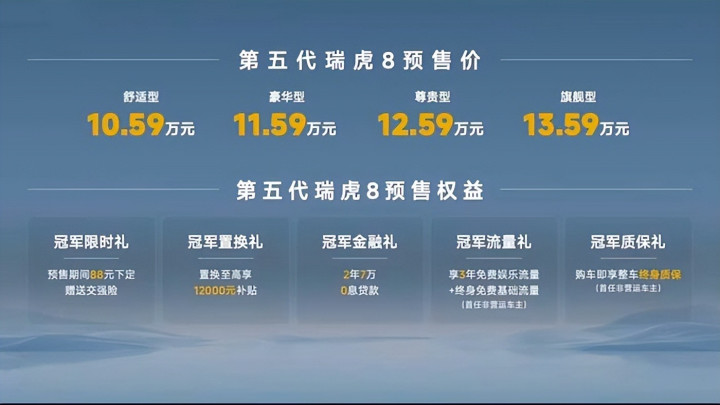 第五代瑞虎8此次预售推出舒适型、豪华型、尊贵型、旗舰型四款配置,预售指导价区间为10.59万-13.59万元,以极具竞争力的价格切入家庭SUV市场。同时,奇瑞为首批用户带来“冠军五重礼”诚意政策:预售期间88元下定即赠交强险;置换至高享12000元补贴,降低换车门槛;2年7万0息贷款缓解购车资金压力;首任非营运车主可享3年2G/月免费娱乐流量+终身免费基础流量,以及整车终身质保的安心保障。从价格到政策,每一项都精准击中家庭用户对“高性价比”与“靠谱保障”的核心需求。